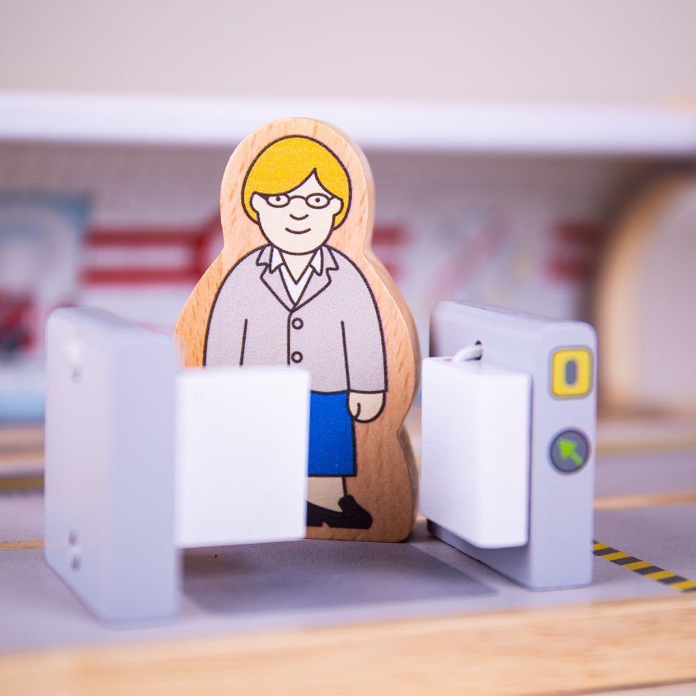 Dieses Holzspielzeug enthält einen Fahrkartenautomaten, eine Fahrkartenkontrolle und 3 Fahrgastfiguren.