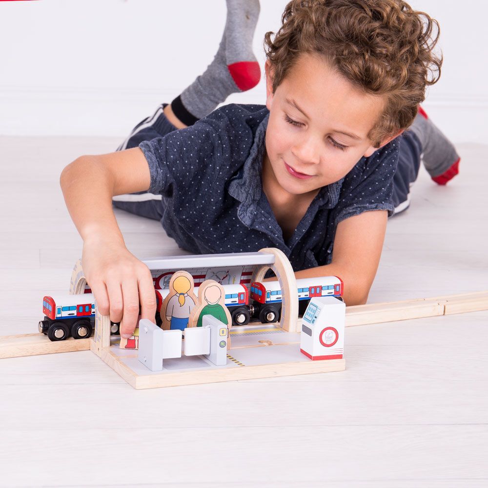 Auf dem ersten Gleis fährt ein U-Bahn-Zug, bitte überqueren Sie nicht die gelbe Linie! Die U-Bahn-Station ist eine hölzerne Nachbildung der legendären Londoner U-Bahn-Station, in der die Fahrgäste Fahrkarten kaufen, durch die Schranke gehen und in die U-Bahn einsteigen.