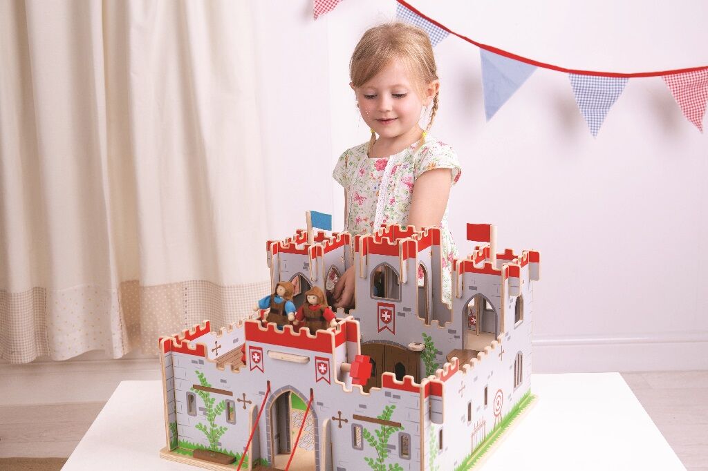 Das hölzerne King George Castle verfügt über eine voll funktionsfähige Zugbrücke, Balkone und bewegliche Türen. Du wirst sogar eine Geheimtür finden, durch die die Ritter unbemerkt vom Feind entkommen können! Halte die Burg mit der Zugbrücke unter Kontrolle und tausche rote und blaue Fahnen aus, je nachdem, wer die Burg erobert hat. Genieße das magische Spiel, aber vergiss nicht, wachsam zu sein! Einfach die Holzteile zusammenstecken und schon kann das Abenteuer beginnen. Es ist eine großartige Möglichkeit, die Fähigkeiten zum Geschichtenerzählen, den Wortschatz und die Geschicklichkeit der Kinder zu fördern. Hergestellt aus hochwertigen Materialien aus verantwortungsvollen Quellen. Zahlen sind nicht enthalten, können aber hinzugefügt werden.