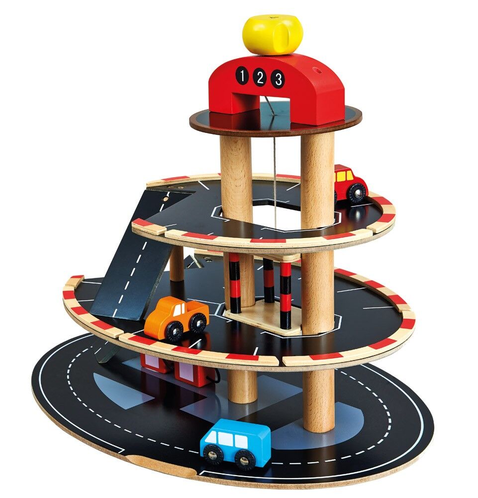 Lassen Sie Ihren kleinen Autofahrer in dem zweistöckigen Parkhaus mit mehreren bunten Autos parken. Die Garage ist auch mit einem einfachen Aufzug ausgestattet.