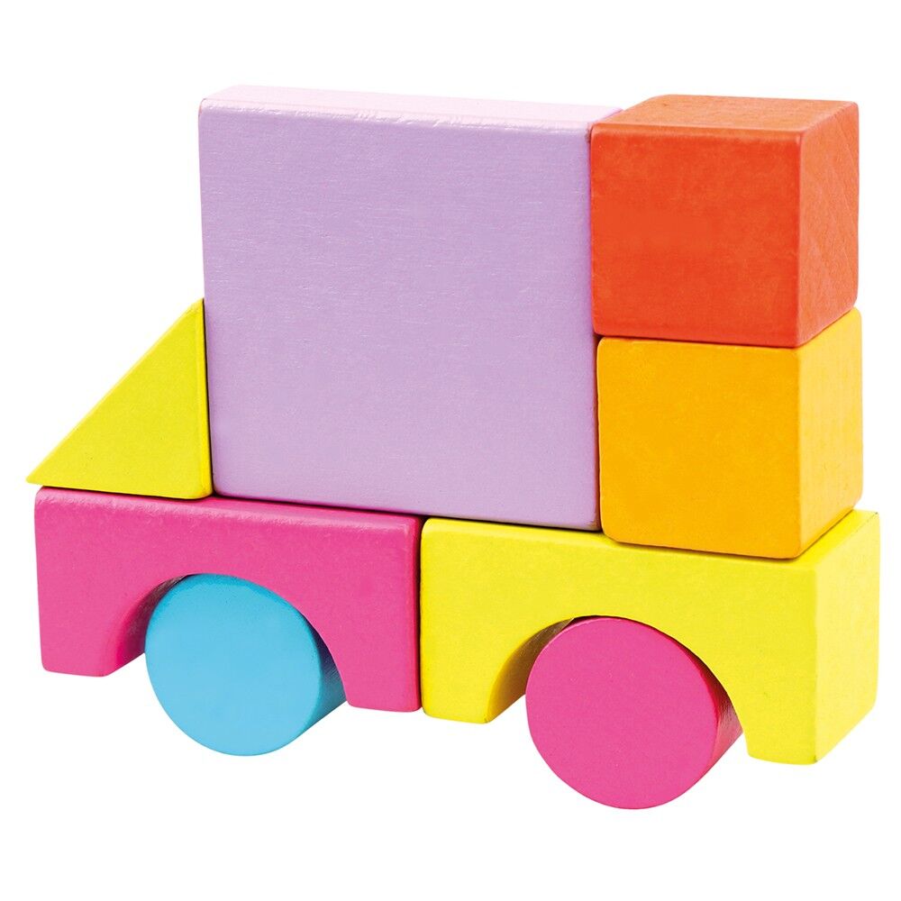 Würfel in leuchtenden, attraktiven Farben und verschiedenen Formen in einem praktischen Eimer aus Pappe. Der Deckel des Eimers verwandelt die Packung in ein spielerisches Puzzle und kann die Formerkennung und die Feinmotorik fördern.