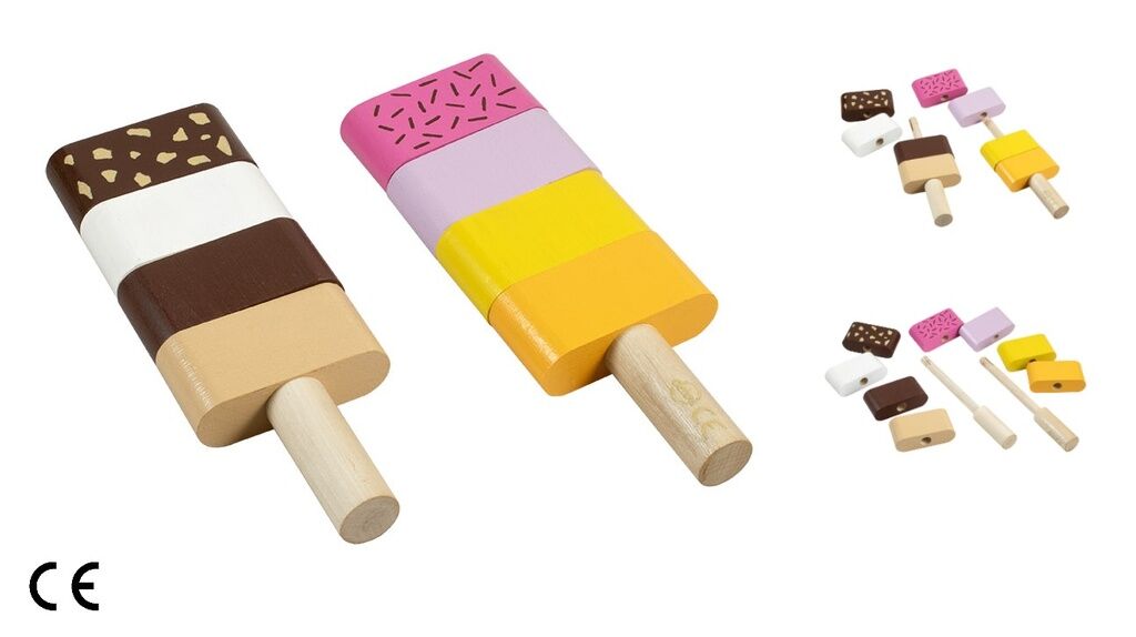 Ein Motorikspielzeug aus Holz, das durch seine Farben die Blicke auf sich zieht. Geeignet zur Entwicklung der Vorstellungskraft und des logischen Denkens. Mit diesen faltbaren Eis am Stiel kann Ihr Kind die Farben nach Belieben kombinieren. Durch das Aufstecken der Teile auf die Stange wird zudem die Feinmotorik geübt. Zum Spielzeug gehören 2 Einfädelstäbe, 6 Stück mit Loch und 2 Endstücke. Es entspricht den aktuellen europäischen Sicherheitsstandards.