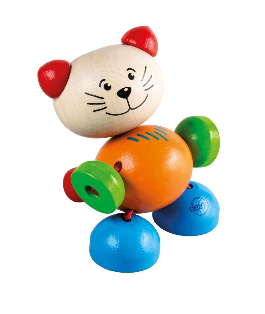 Ein Spielzeug aus bunten Holzformen, die auf Gummi aufgereiht sind und sich bewegen, drehen und biegen lassen. Die Katze ist 8 cm lang und auf einer Papierkarte befestigt. Geeignet zum Üben der Feinmotorik der Hände Ihrer Kinder ab 8 Monaten.