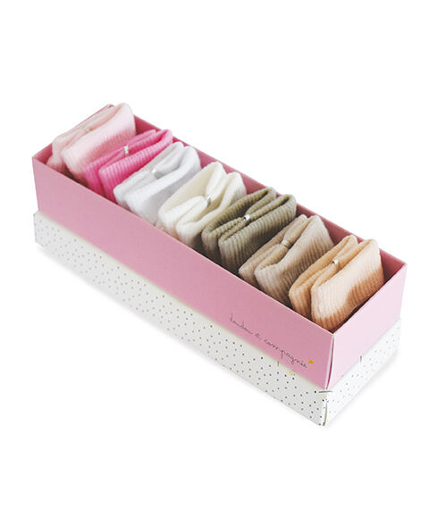 Das schöne Sockenpaket in der Geschenkbox für Neugeborene besteht aus sieben Paar Socken. In Farben für Baby-Mädchen. Verschiedene Socken für jeden Tag der Woche. Das originelle Geschenk zur Geburt eines Babys.