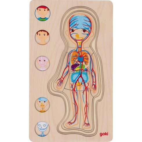 Haben Sie ein neugieriges Kind, das ständig nach allem fragt und sich fragt, wie die Dinge funktionieren? Und will er wissen, wie es im Inneren des Körpers aussieht? Dieses aus farbigen Schichten bestehende Holzpuzzle zeigt deutlich die innere Anordnung des Körpers des Jungen – Skelett, Blutkreislauf, innere Organe und Muskeln. Ziehen Sie Schicht für Schicht ab und erkunden Sie kleine und große Knochen, Arterien und Venen. Können Sie herausfinden, wo sich Lunge, Leber oder Milz befinden? Dieses Holzpuzzle bringt nicht nur neues Wissen, sondern schult gleichzeitig auch die motorischen Fähigkeiten der Kinder.