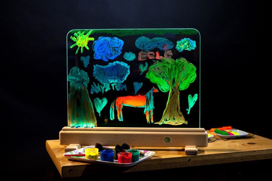 Der exklusive magische Leuchttisch bietet eine Vielzahl von Einsatzmöglichkeiten. Der Tisch aus gehärtetem Glas kann vor allem mit Wasserfarben, mit Pinseln oder Fingern, aber auch mit abwaschbaren Stiften bemalt werden. Es kann auf beiden Seiten gemalt werden, so dass die Kinder gemeinsam ein Bild gestalten können. Nach dem Gebrauch kann die Platte leicht gereinigt und für weitere Arbeiten vorbereitet werden. Für eine angenehme Beleuchtung sorgen energiesparende LEDs im unteren Rahmen des Tisches. Helligkeit, Farbe und Lichtmodus können frei eingestellt werden, wobei eine Vielzahl verschiedener Einstellungen möglich ist. Der Tisch ist stromversorgt und wird mit einem 12 V/2 A-Adapter mit Netzstecker für normale 230 V-Steckdosen geliefert. Der Controller wird mit einer einzigen CR2025-Batterie (nicht im Lieferumfang enthalten) betrieben. Nicht geeignet für Epileptiker.