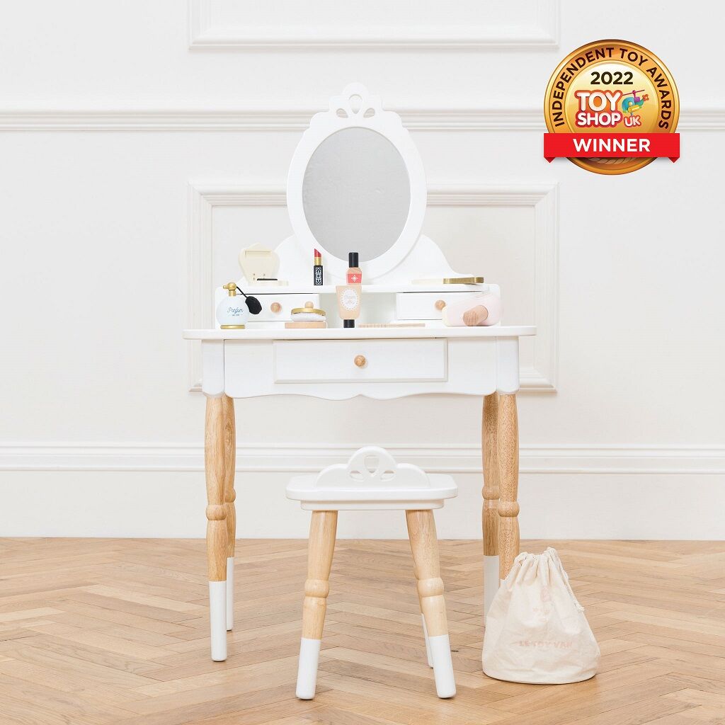 Ein schöner Schminktisch im Retro-Stil, der so manchen Kindertraum wahr werden lässt. Er fällt in einem Kinderzimmer oder Spielzimmer auf, ist sehr elegant und erregt die Aufmerksamkeit der Kinder beim Spielen. Viktorianischer ovaler Spiegel (Spiegelfolie), doppelstöckiger Schminktisch, 3 Schubladen - perfekt, um Schätze und Kleinigkeiten zu verstecken. Dieses schöne Stück wird von einem Team talentierter Spielzeugmacher aus nachhaltigem Gummibaumholz mit viel Liebe zum Detail hergestellt. Sowohl der Tisch als auch der Stuhl haben interessant geformte Beine. Eine Kombination aus weißem und natürlichem Holz sorgt für ein zeitloses Aussehen. Schöne Möbel, die von Generation zu Generation weitergegeben werden.