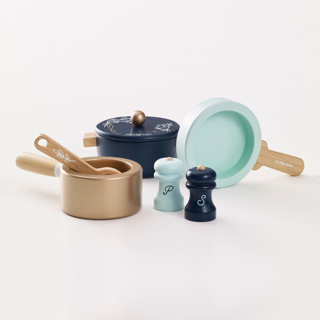 Eine Reihe von Gerichten für junge Kochanfänger. In einem großen Topf mit Deckel, einem Topf mit Henkel und einer Bratpfanne lassen sich fantasievolle Leckereien zubereiten. Weiteres Zubehör des Sets sind ein Holzlöffel, ein Salzstreuer und ein Pfefferstreuer. Das Spielzeug ist aus nachhaltigem Massivholz gefertigt und mit ungiftigen Farben auf Wasserbasis handbemalt. Auch als Ergänzung für Kinderküchen geeignet.