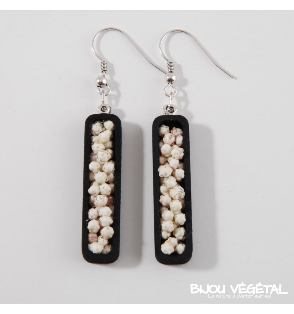 Living Jewellery - Jardiniere Ohrringe schwarz mit weißen Dauerblumen Ein wunderschönes Modeaccessoire in einer kräftigen Farbe, kombiniert mit weißen Dauerblumen, die ein außergewöhnlich elegantes, lebendes Schmuckstück bilden. Die lebenden Juwelen werden mit einer patentierten Technologie stabilisiert und benötigen praktisch keine Wartung. Der lebende Schmuck ist in einer Schachtel verpackt, eine Ersatzstaude ist enthalten. Der Live-Schmuck wird in Frankreich handgefertigt. Der Hersteller garantiert eine unbegrenzte Lebensdauer bei sachgemäßer Anwendung. Lebendiger Schmuck darf keinen großen Temperaturschwankungen und keiner direkten Wasserströmung (beim Baden, Geschirrspülen usw.) ausgesetzt werden. Lebendiger Schmuck wurde erstmals 2015 auf der internationalen Schmuckmesse Bijorhca in Paris vorgestellt. Sie wurden von den Designerinnen und langjährigen Freundinnen Maryse und Manuella für Radis et Capucine entworfen. Der lebendige Schmuck ermöglicht eine ständige Verbindung mit der Natur und bringt sie buchstäblich zum Greifen nah.