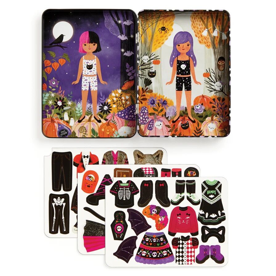Tauche mit diesem Magnet-Set in die Welt der Mode ein und wecke die Kreativität deiner Kinder. Entdecke deinen Stil und deine Fantasie und stelle Halloween-Kostüme nach deinen eigenen Vorstellungen zusammen. Das Spiel enthält zwei illustrierte Hintergrundszenen. In jedem Teil wartet eine Dame auf ihr gruseliges Outfit. Auf drei Karten befinden sich über 45 Magnete mit themenbezogenen Kleidungsstücken und Accessoires. Kombiniere alles nach deinen eigenen Vorstellungen. Geeignet für zu Hause und unterwegs.