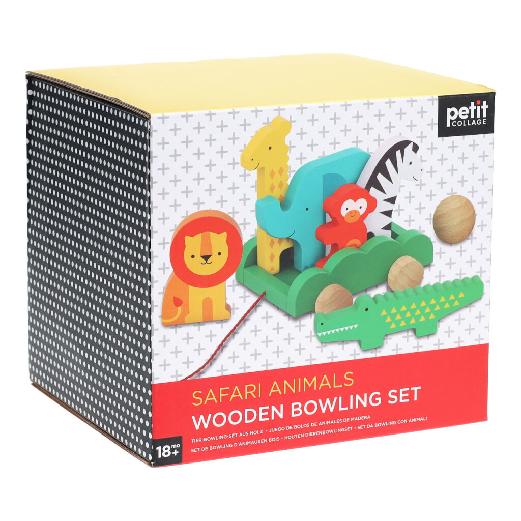 Die farbenfrohen Figuren der lächelnden Tiere im Wagen warten darauf, dass Kinder sie aufstellen und versuchen, sie mit dem mitgelieferten Ball zu rollen. Die unterschiedlichen Formen erschweren das Abschlagen der Figuren auf unterschiedliche Weise. Die Tiere können leicht in vielen anderen fantastischen Spielen verwendet werden. Das Spielzeug fördert die Grobmotorik, die motorische Koordination und die Sensomotorik.