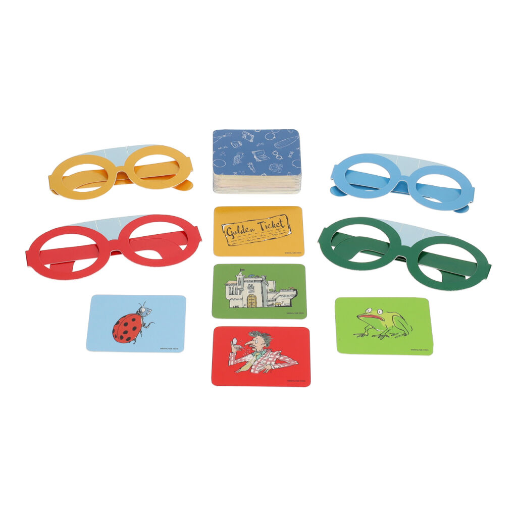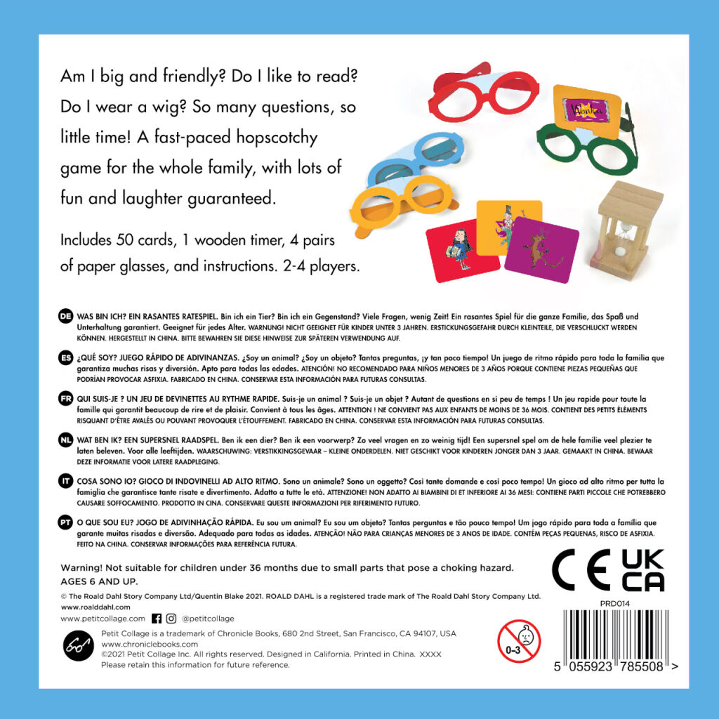 Ziehe eine Karte, stecke sie in eine lustige Brille, damit die anderen sie sehen können, und drehe die Sanduhr. Versuchen Sie dann durch eine Reihe von Fragen und Antworten Ihrer Teamkollegen zu entschlüsseln, welche Figur oder welchen Gegenstand aus Roald Dahls weltberühmten Geschichten Sie in der vorgegebenen Zeit gezeichnet haben. Die Zeit ist knapp, Sie müssen die Fragen schnell, aber sorgfältig abwägen! Die Karten sind mit Originalillustrationen aus den Büchern verziert. Die mitgelieferten Gläser gibt es in zwei Größen, für Kinder und Erwachsene, so dass sich das Spiel besonders für die Familie eignet. Die Stücke werden aus nachhaltig erzeugtem Papier hergestellt, mit pflanzlicher Tinte bedruckt und in einer praktischen, bunt illustrierten Schachtel verpackt.