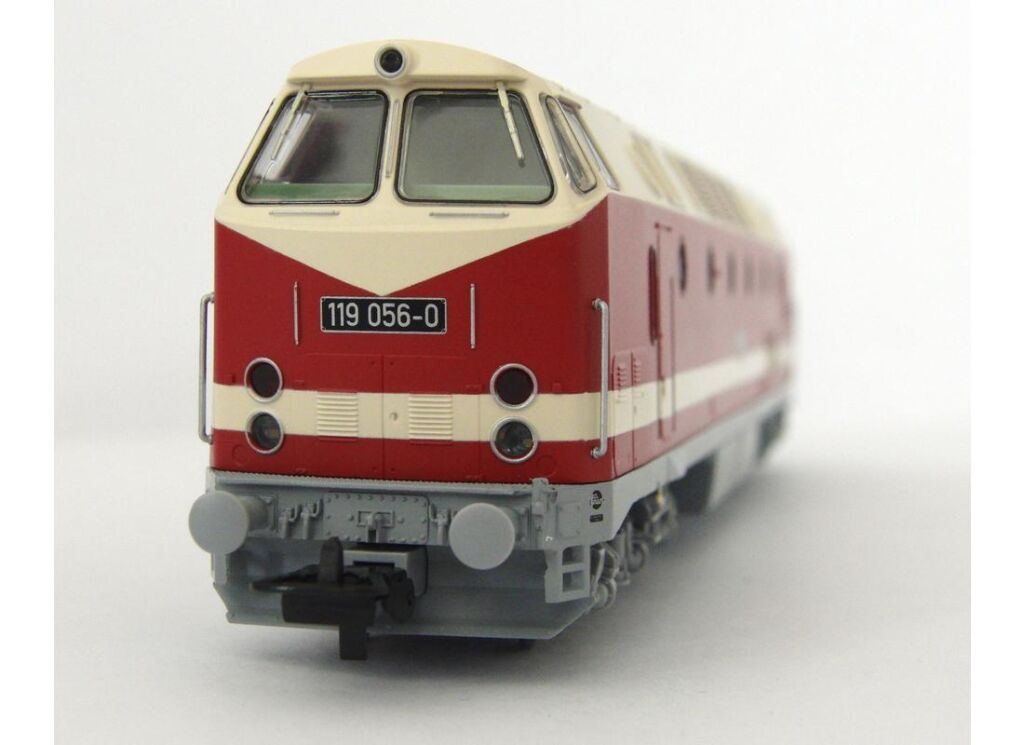 Ein originalgetreues und detailliertes Modell der Diesellokomotive BR 119, bekannt als "U-Boot" in der älteren Version mit dem zentralen Scheinwerfer oberhalb der Führerstandsfenster, in DR-Ausführung. Das Modell basiert strukturell auf dem Typ V 180, ähnlich dem Prototyp, und hat somit die gleichen Eigenschaften. Die Farbgebung und der Druck, einschließlich aller dekorativen Elemente, sind von höchster Qualität und entsprechen der Expert-Serie. Das Modell ist mit einem leistungsstarken, schwungradbestückten Motor ausgestattet und das Drehmoment wird in einem diagonal angeordnetenDie vier Achsen werden von vier Achsen angetrieben. Die weiß/rote LED-Beleuchtung wechselt je nach Fahrtrichtung. Das Modell kann mit einem separat ausgewiesenen Digitaldecoder mit Soundmodul und Lautsprecher erweitert werden.