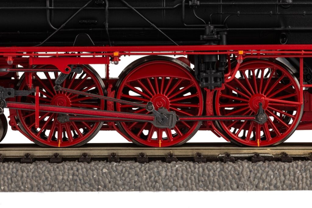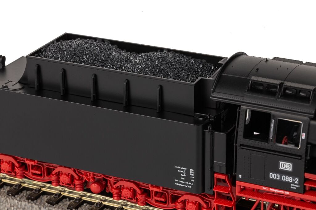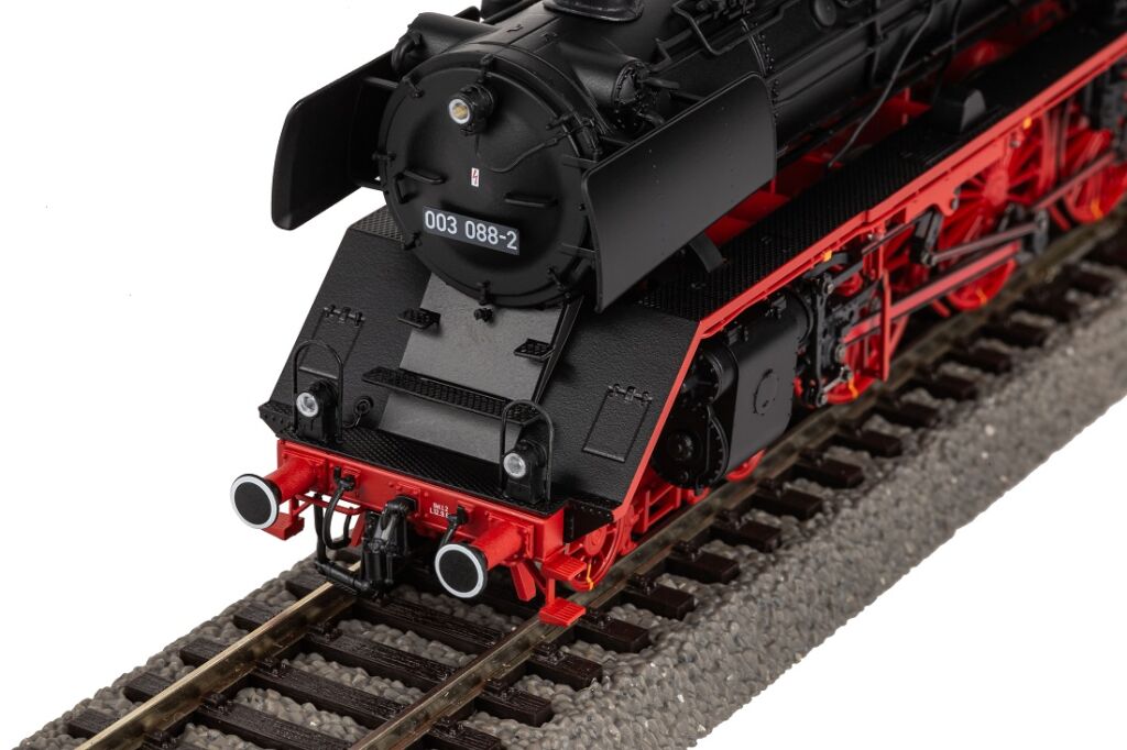 Neu für 2023. Das Modell der Klasse 003 zeichnet sich durch einen hohen, schlanken Kessel und einen luftigen, offenen Rahmen mit freier Sicht aus. Das filigrane Fahrwerk mit feinen Speichen und markant geformten Gegengewichten wirkt besonders elegant. Das neue Design besticht durch passende Zusatzteile wie Glocken, Pumpen und Lampen. Eine Reihe verbundener Kesselrohre rundet das äußere Erscheinungsbild ab. Der Antrieb inklusive Schwungrad befindet sich im Tender und sorgt für optimale Fahreigenschaften. Die XP-Version verfügt über schaltbare Beleuchtung im Motor- und Führerstand, eine rot blinkende Feuerbüchse und einen radsynchron gesteuerten Impulsverdampfer.