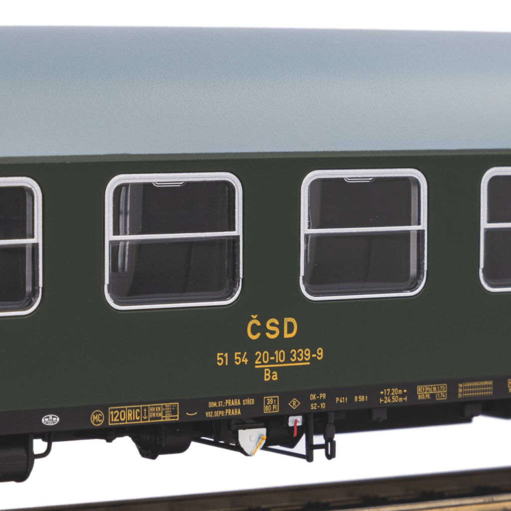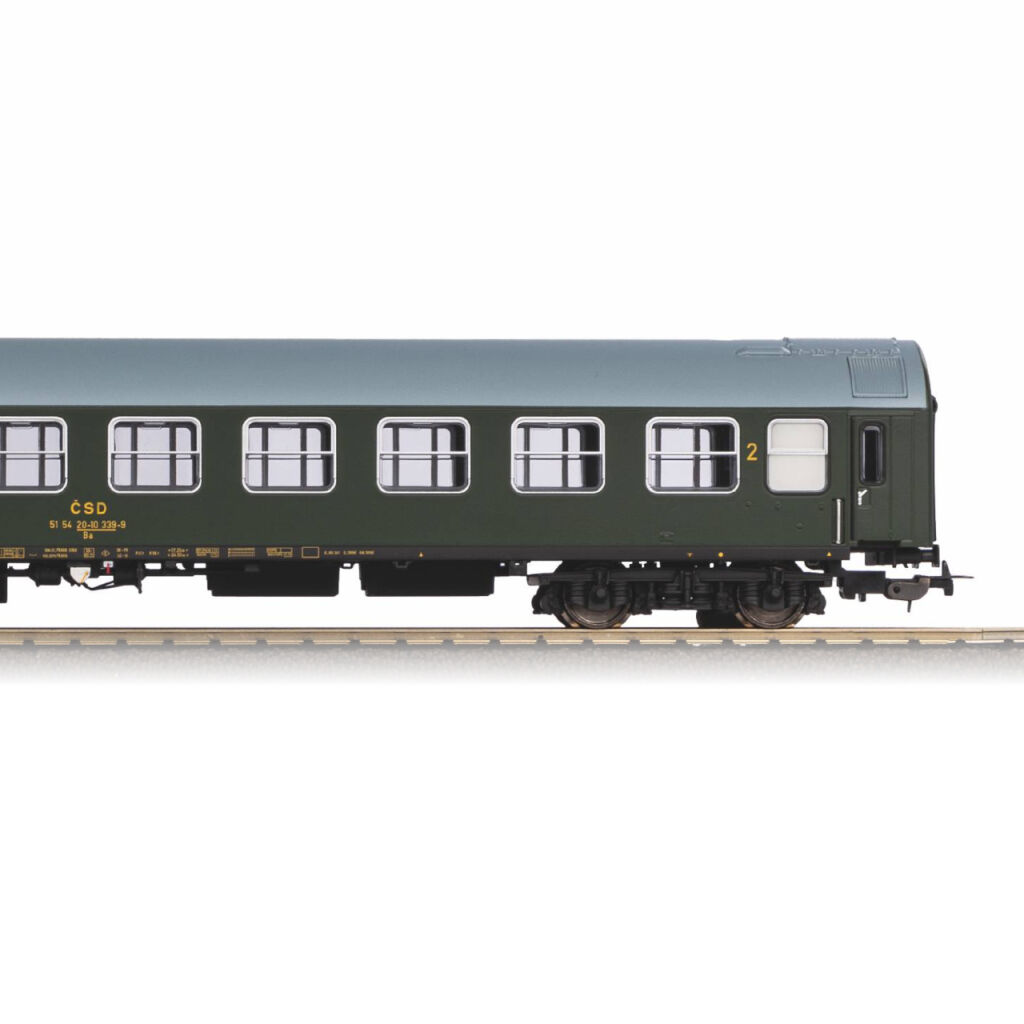 Selbstverständlich kann der Wagen mit Kurzkupplungen nachgerüstet werden, so dass er sich perfekt an die Zusammenstellung langer Zuggarnituren anpassen lässt. Es bietet zudem die Möglichkeit der Nachrüstung mit einem speziell ausgelegten LED‑Modul für die Innen- und Endbeleuchtung und einem Steuerdecoder. Für den Nachbau von historischen Zuggarnituren können wir besonders eine der Diesellokomotiven T679.1 „Sergej“ (Nr. 52819 und 52814) oder die Elektrolokomotiven S 499.1 „Laminátka“ (Nr. 51380 und 51382) empfehlen, die Sie in unserem Angebot finden.