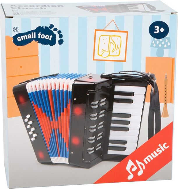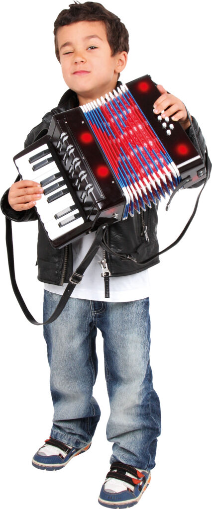 Das neue Design eines der beliebtesten Instrumente im Sortiment bringt die Welt der Musik ins Kinderzimmer! Dank der verstellbaren Schultergurte müssen die Kinder das Instrument nicht in der Hand halten und können sich auf das Spielen konzentrieren. Noch mehr Tasten auf der glänzend lackierten Mundharmonika sorgen für das Vergnügen, verschiedene Harmonien zu hören und schulen auf künstlerische Weise die Feinmotorik.