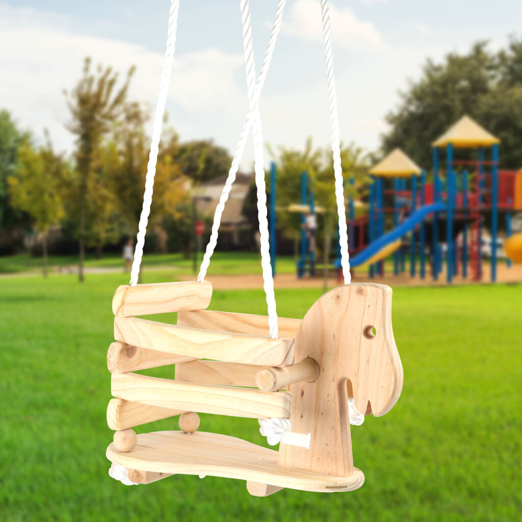 Hyah, nach vorne schwingen! Die niedliche Pferdekopfschaukel ist nicht nur bequem, sondern dank des geräumigen Sitzes, der Rückenlehne und des erhöhten Geländers auch sehr sicher. An den Seiten befinden sich Griffe, an denen sich die Kinder festhalten können, was das Schaukeln noch sicherer macht. Es ist aus sorgfältig verarbeitetem Holz gefertigt und bietet eine natürliche Oberfläche, die nach eigenen Vorstellungen gefärbt werden kann. Die Aufhängung besteht aus starken, haltbaren, aber auch biegsamen Nylonseilen, die mit Metallringen zum Aufhängen versehen sind.