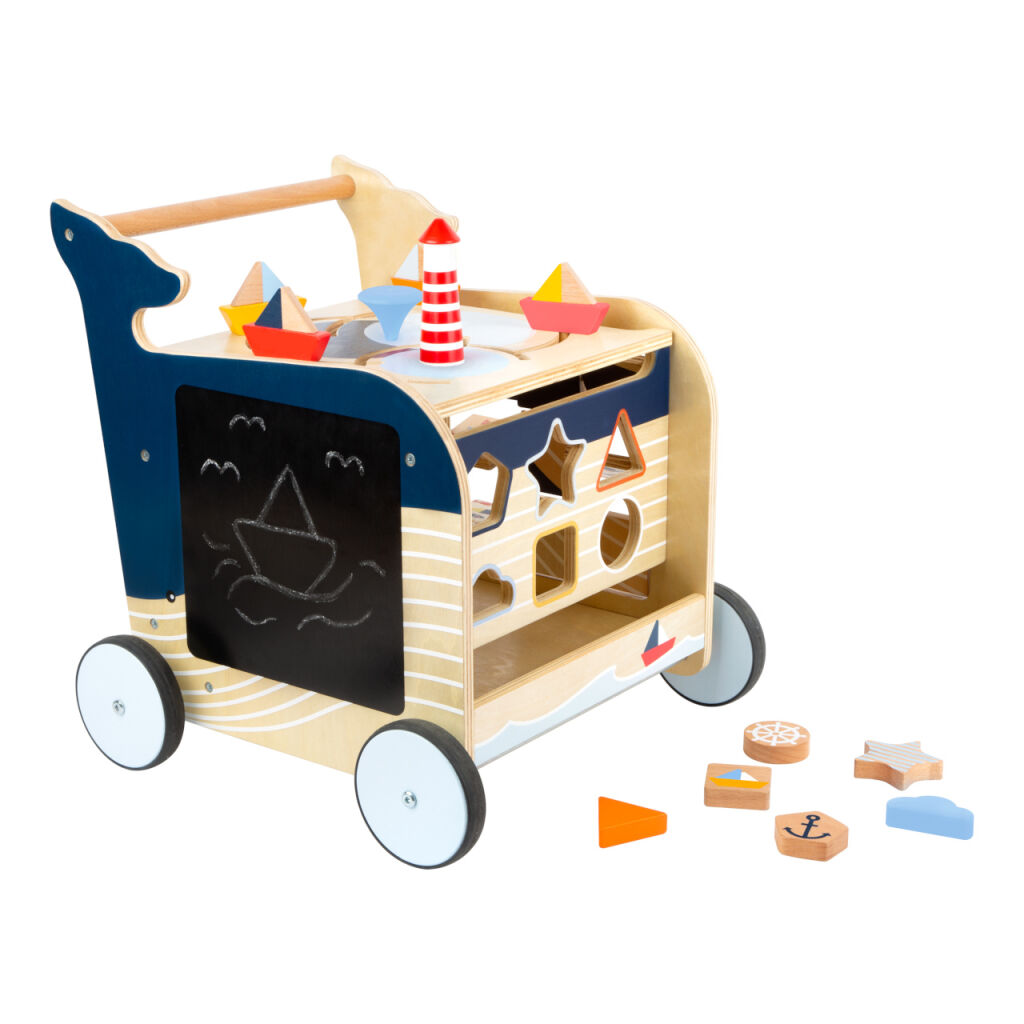 Lass uns mit dem Wal auf Entdeckungsreise gehen! Dieser hölzerne Lauflernwagen in Form eines Wals hilft Kindern bei ihren ersten Schritten und bietet gleichzeitig Spielzeug zur Förderung der motorischen Fähigkeiten. Der Wanderer folgt dem Stil der Meereswelt und ihrer Tiere. Auf den vier Seiten des Walkers finden sich Spiele wie das Einsetzen von Formen, das Drehen von Bildern oder ein Zeichenbrett. Die Kinder können zählen lernen, die Himmelsrichtungen bestimmen oder die Jahreszeiten unterscheiden. Die Lauflernhilfe hat gummierte Räder, die sie leise und sicher machen. Der Rollator lässt sich oben öffnen und die Tür ist mit einem Fingerschloss versehen. Sie können also alle Blöcke darin speichern. Außerdem gibt es ein Bremssystem, das Unfälle verhindert.