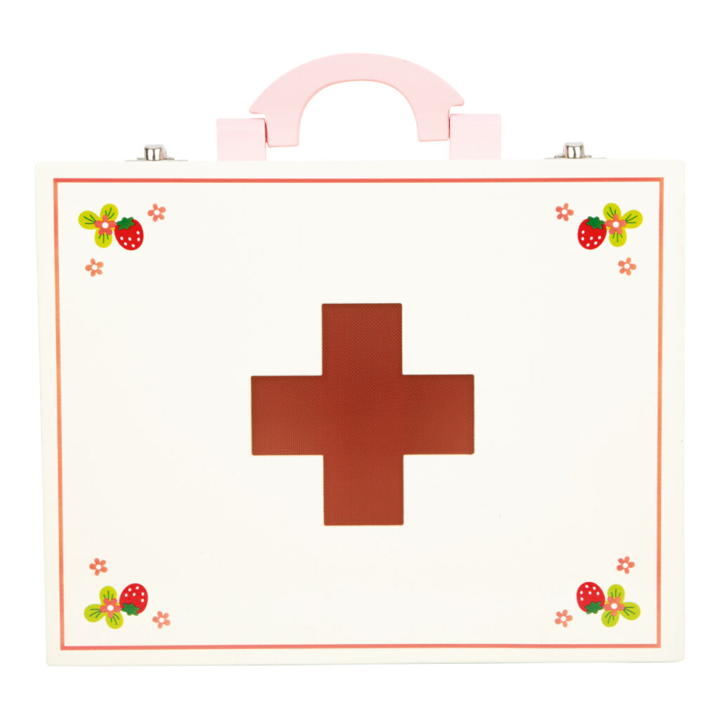 Der farbenfrohe Holzkoffer für die kleine Krankenschwester enthält 24 Stück buntes Holzzubehör, darunter ein textiles Stirnband mit einem roten Kreuz. Der Koffer enthält alles, was ein Arzt braucht - Thermometer, Stethoskop, Spritze, Salben, Medikamente... Alle sind aus Holz. Das Erdbeermotiv auf den einzelnen Instrumenten ergänzt das fröhliche Design.