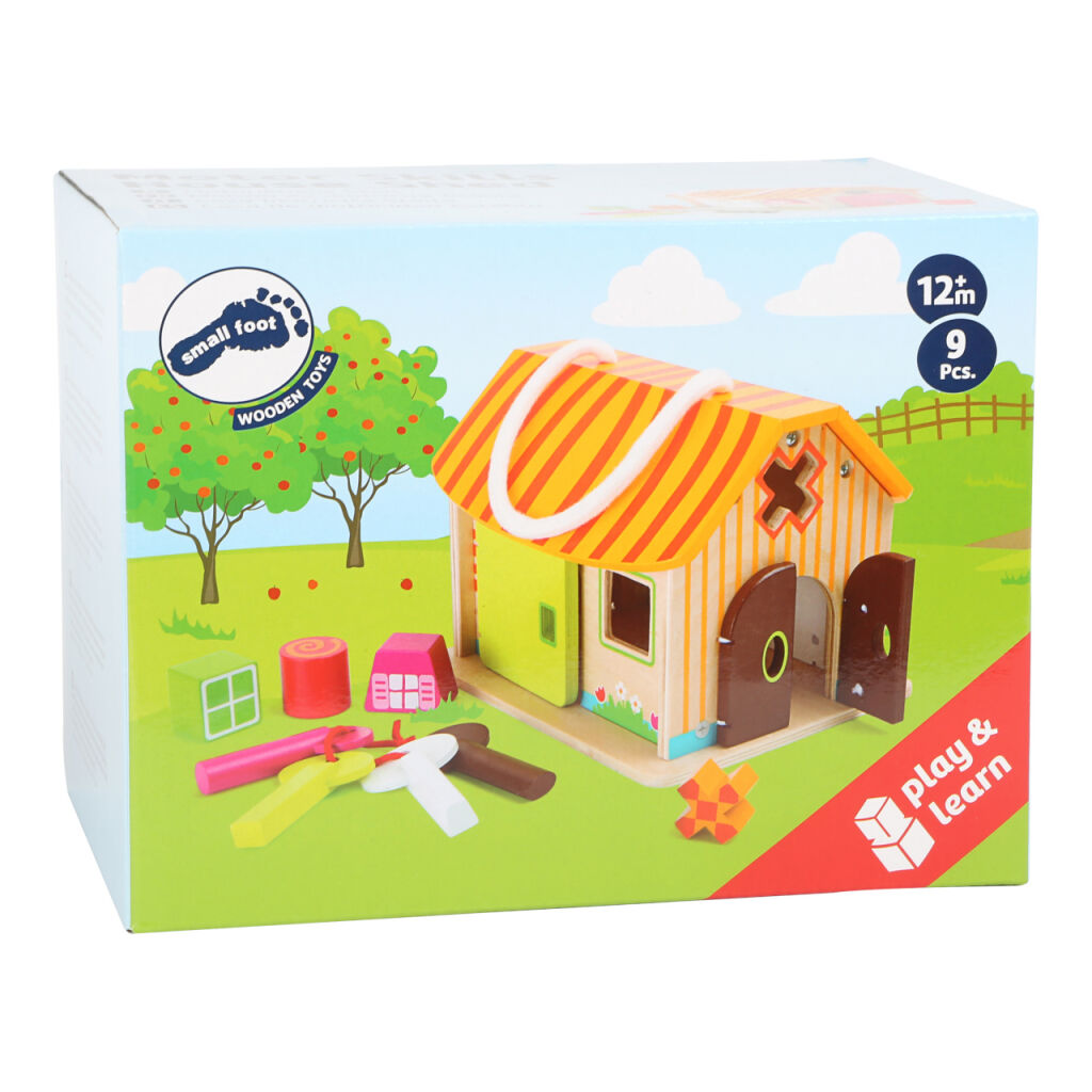 Dieses Holzhaus ist hervorragend geeignet, um die motorischen Fähigkeiten der Kinder zu trainieren. Jeder Schlüssel passt zu einer anderen Tür. Dank der Gummibänder bleiben sie offen. Die Bausteine haben unterschiedliche Formen, die in das richtige Loch eingesetzt werden müssen. Für den Transport des Hauses wird eine Schnur verwendet.