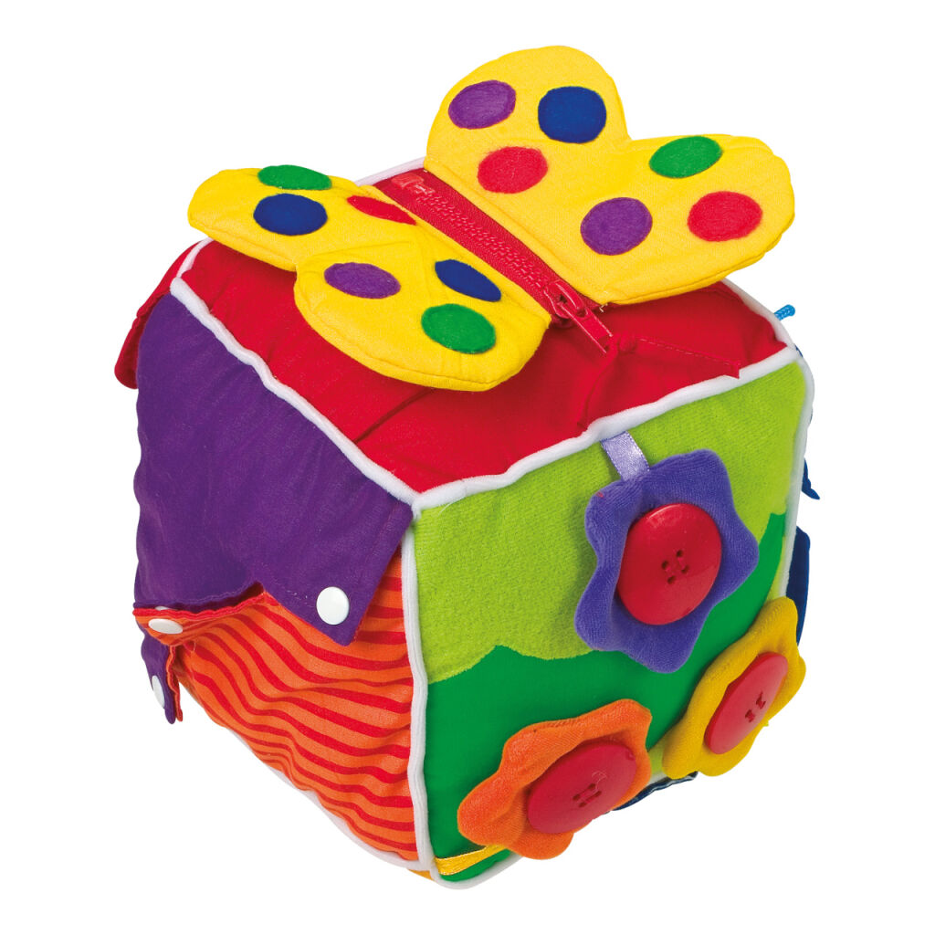 Plüschwürfel mit verschiedenen Befestigungen für motorische Übungen der Kinderfinger. Jede Befestigungsart befindet sich auf einer anderen Seite des Würfels – Schnürsenkel, Knöpfe, Reißverschlüsse, Druckknöpfe, Klettverschluss und Nylonschnürsenkel.