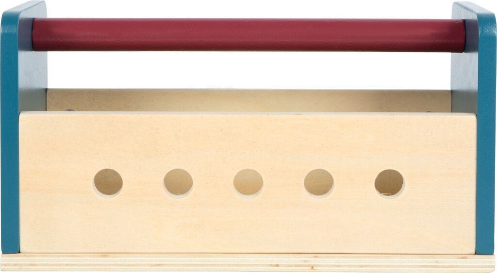 Robustes Werkzeugset aus Holz im Tragekoffer. Ein praktisches 2-in-1-Spielzeug: Wenn Sie den Werkzeugkasten umdrehen, können Sie ihn als Arbeitstisch verwenden! Dank dieses Gadgets bietet das Spielzeug Kindern endlose Spielmöglichkeiten, sie können sogar unterwegs spielen. Im Paket finden Sie 3 Werkzeuge – einen Hammer, einen Schraubenschlüssel, einen Schraubendreher und weiteres reichhaltiges Zubehör. Dank der Löcher können Sie Werkzeuge problemlos in der Kiste aufbewahren oder befestigen. Dank dieses Sets haben kleine Handwerker ihre Ausrüstung immer griffbereit.