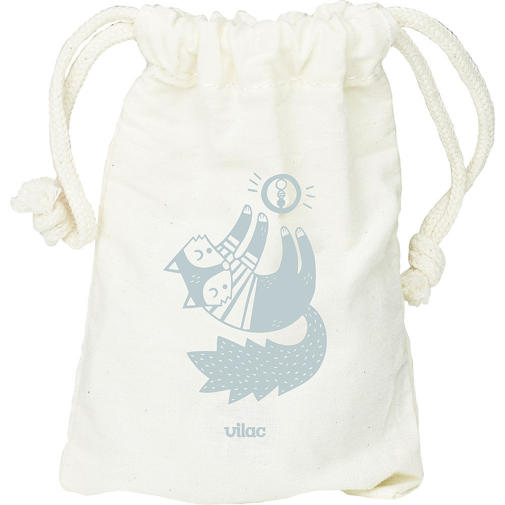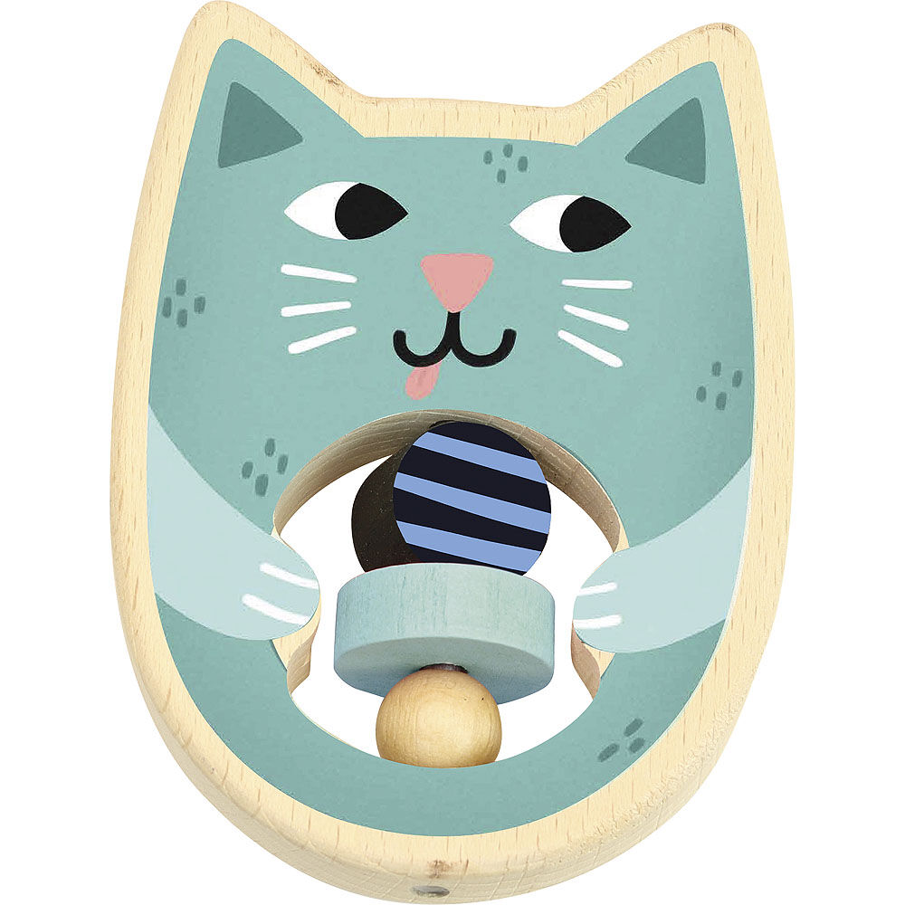 Schöne Holzrassel mit Katzenmotiv, entworfen von Michelle Carlslund. 3 bunte Perlen in der Mitte, die angenehm klappern. In einem Stoffbeutel verpackt, ist es ein ideales Geburtstagsgeschenk. Hergestellt in Frankreich.