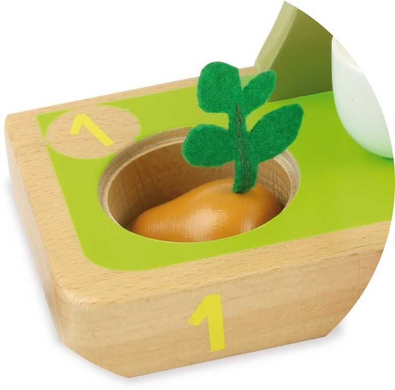 Ein Spiel, das die Sinne der Kinder weckt, ist ideal zum Erlernen des Zählens und der Formerkennung. Dieses Holzspielzeug besteht aus einem Grundbrett, Gemüse und einem Baum mit drehbaren Teilen. Zu den Gemüsesorten gehören Karotten, Lauch und Tomaten. Die Kinder fädeln das Gemüse und die Gemüsestücke auf Holzstäbchen auf. Der höchste der Stöcke ist an einer Schnur befestigt, falls das Kind darauf fällt, wird der Stock abgelenkt. Das Spielzeug ist für die Altersgruppe 1,5+ zertifiziert.