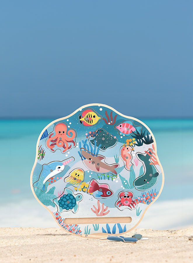 Das Spiel beinhaltet: 12 Meerestiere aus Holz, 2 Holzstäbe mit Magneten und 1 Spielunterlage