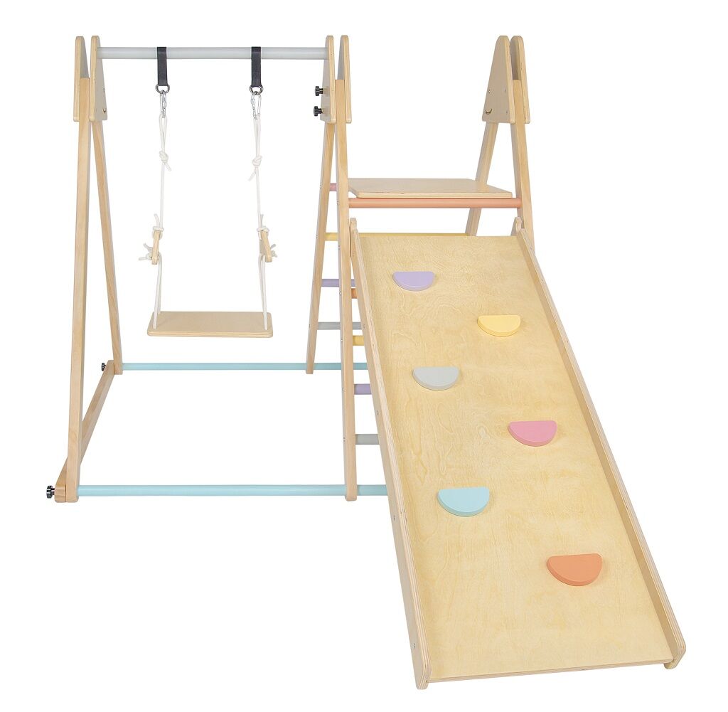 Das Holzspielset ist für den Innenbereich konzipiert und bietet nicht nur ein praktisches, geschmackvolles Design, sondern auch einen funktionalen Nutzen. Durch das Design und die gewählte Farbgebung - natürliches Holz kombiniert mit gedeckten, pastelligen Tönen - wird es zu einer tollen Ergänzung für jeden Raum! Die Multifunktionalität dieses Spielsets bietet eine breite Palette von Aktivitäten wie Krabbeln, Schaukeln, Rutschen oder Klettern. Dank dieser Aktivitäten entwickeln Kinder motorische Fähigkeiten, Gleichgewicht oder Bewegungskoordination. Das Produkt besteht aus einer Schaukel, einer Leiter und einem Brett mit pastellfarbenen Griffen. Die Montage durch einen Erwachsenen ist erforderlich. Wird mit einer ausführlichen Montageanleitung geliefert (CZ, SK, EN).